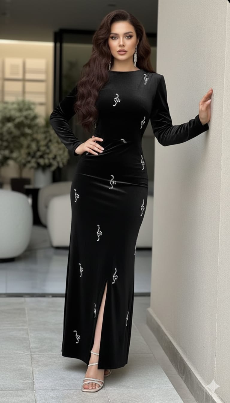 فستان سهرة مخمل فاخر بأناقة لا تُقاوم. خامة المخمل الفخمة تعطيك لمسة من الرفاهية والنعومة، مع تصميم يتناغم مع جسمك بكل رشاقة. خيار مثالي للمناسبات الفخمة والحفلات الراقية، عشان تكونين في قمة التألّق والجمال.