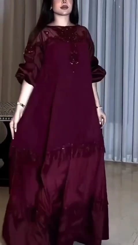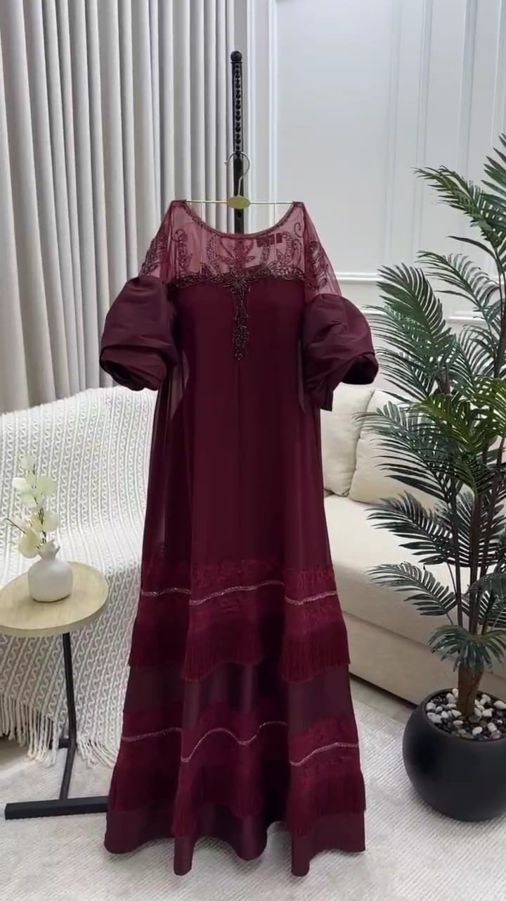 استمتعي بإطلالة ساحرة مع فستان السهرة الراقي ذا خامة جورجيت شانطون الخفيفة، مزين بالهدب والتطريز اليدوي اللي يضيف لمسة فخامة وأسلوب ملكي. البطانة من كرب استريتش تعطيكي راحة مثالية مع حرية حركة كاملة، مثالي لكل سهرة أو مناسبة خاصة تحبين تكوني فيها نجمة الحفل.