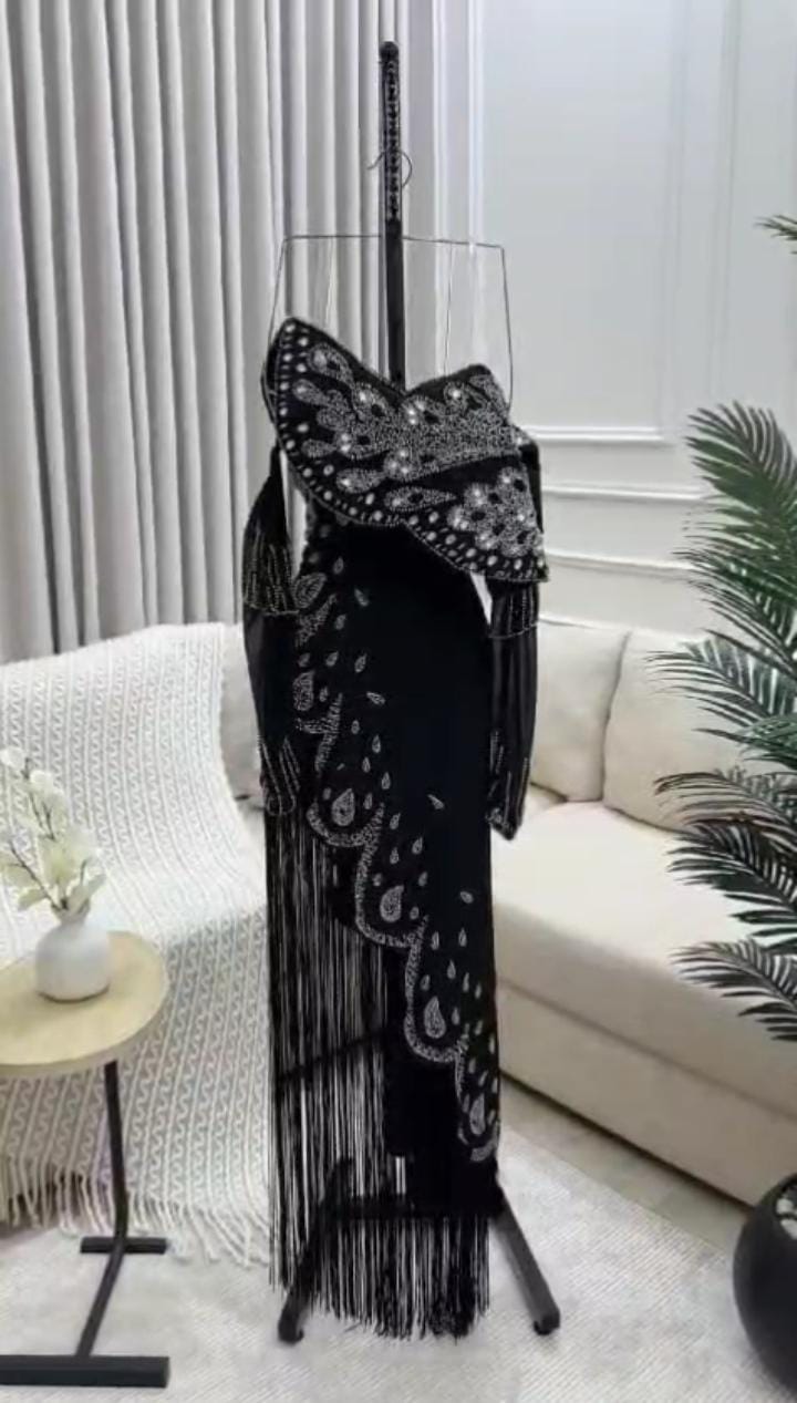 "إذا كنتِ تبغين إطلالة راقية ومميزة، هذا الفستان هو الخيار المثالي! فستان سهرة مطرز يدويًا بتفاصيل دقيقة وفنية، كل غرزة فيه تروي قصة من الفخامة والأناقة. التطريز اليدوي يضيف لمسة فريدة من نوعها، والموديل راح يخليكي تتألقين بأناقة ساحرة في كل مناسبة. هذا الفستان بيخليكي تكونين محط الأنظار في كل حفل وتبهرين الجميع."