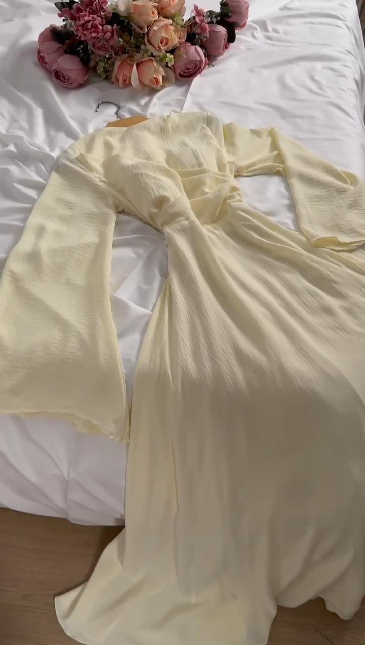 فستان كريمي بأكمام واسعة، تصميم فخم يناسب كل الأوقات! إذا كنتِ تبحثين عن إطلالة تجمع بين الراحة والأناقة، هذا الفستان هو الخيار المثالي لكِ. قماش ناعم وخفيف يعكس لمسة من الفخامة، والأكمام الواسعة تضيف لمسة من العصرية والأنوثة. سواء كنتِ طالعَة لمناسبة خاصة أو تبغين إطلالة كاجوال، هذا الفستان راح يكون رفيقك المثالي.