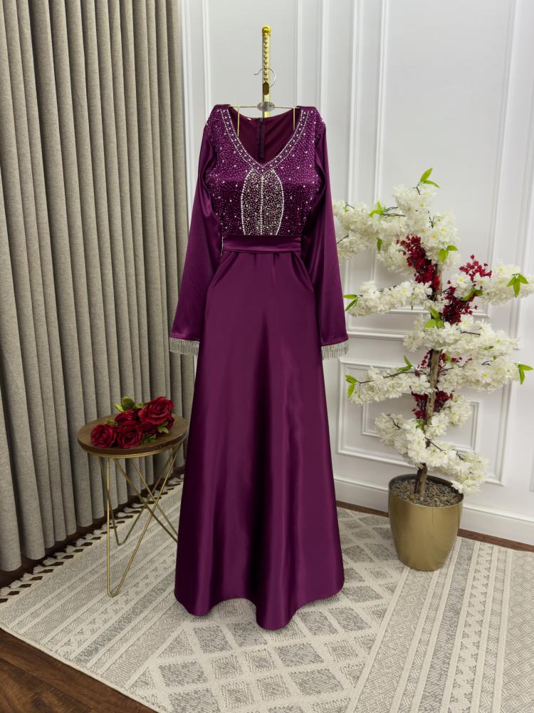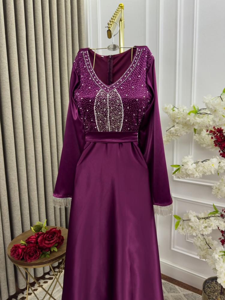فستان سهرة خمري مطرّز بالخرز مع شراشيب أنيقة